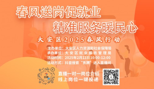 置頂【直播招聘會(huì)】大安區(qū)“春風(fēng)行動(dòng)”線上直播招聘會(huì)預(yù)告