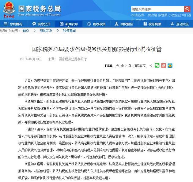 近日,國家稅務總局印發(fā)《通知》,進一步加強影視行業(yè)稅收征管,規(guī)范稅收秩序,積極營造支持影視行業(yè)健康發(fā)展的良好稅收環(huán)境?!锻ㄖ分赋觯耙暺髽I(yè)和影視行業(yè)從業(yè)人員應當依法如實申報并繳納稅款。影視行業(yè)納稅人應當按照實際業(yè)務如實開具增值稅發(fā)票,不得填開或讓他人為自己開具與實際交易內容不符的發(fā)票,不得將不符合規(guī)定的發(fā)票作為所得稅稅前扣除憑證?!锻ㄖ芬?,各級稅務機關要加強對影視行業(yè)的稅源管理。依法確定影視行業(yè)納稅人稅款征收方式。加強對影視企業(yè)和影視行業(yè)從業(yè)人員的稅收風險分類管理,對存在稅收違法行為的依法進行處理,并按規(guī)定列入稅收“黑名單”,推送相關部門開展聯(lián)合懲戒。