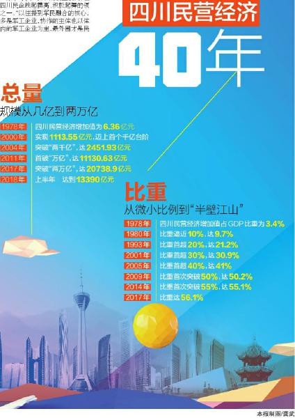 另一條上升曲線,更直觀勾畫(huà)出四川民營(yíng)經(jīng)濟(jì)40年的強(qiáng)勁發(fā)展態(tài)勢(shì):1978年,四川民營(yíng)經(jīng)濟(jì)增加值占GDP比重僅為3.4%;2017年占比已飆升至56.1%。民營(yíng)經(jīng)濟(jì)地位逐年提高,撐起“半邊天”。