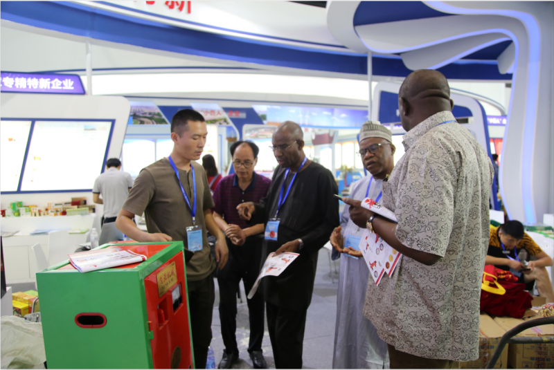 尼日利來采購商在井研飛來機械制造有限公司展區(qū)現(xiàn)場洽談采購業(yè)務。