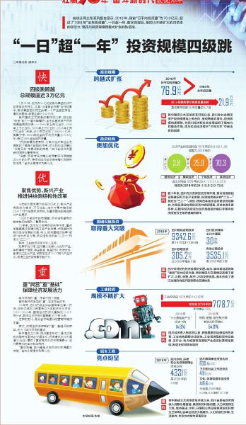 新中國成立尤其是改革開放以來,四川的“吸金”能力一直不斷攀升,全社會固定資產(chǎn)投資規(guī)模呈現(xiàn)四級跳——1985年上百億臺階,1998年上千億臺階,2009年上萬億臺階,2013年上兩萬億臺階。去年,這個數(shù)字達到了28065.3億元。換算下來,2018年我省日平均投資量為76.9億元,超過1984年全年投資量。