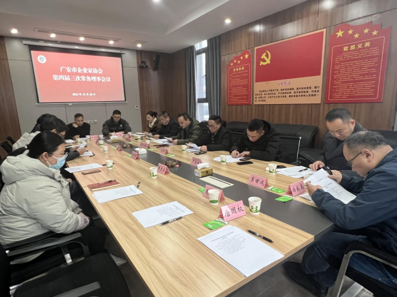 12月28日下午,廣安市企業(yè)家協(xié)會第四屆三次常務理事會議在我市工業(yè)信息化服務平臺順利召開,協(xié)會會長、副會長、常務理事、監(jiān)事參加會議,會議由常務副會長敖超主持。此次會議特邀協(xié)會黨建和業(yè)務指導部門市經(jīng)濟信息化局調(diào)研員呂通兵出席。