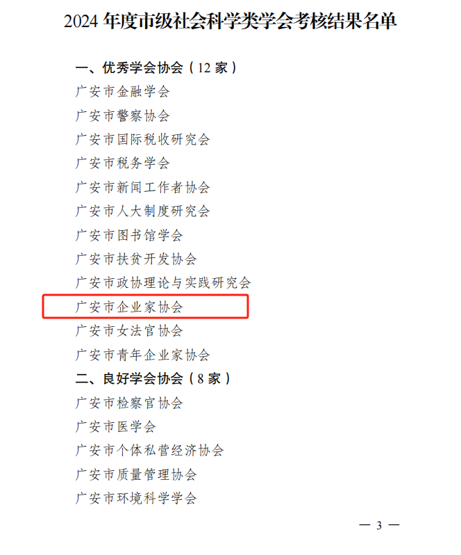 近期,市社科聯(lián)對(duì)市屬社科類學(xué)會(huì)(協(xié)會(huì)、研究會(huì))2024年度工作情況進(jìn)行綜合目標(biāo)考核,經(jīng)申報(bào)自評(píng)、復(fù)核評(píng)估、市社科聯(lián)黨組會(huì)議審定,廣安市金融學(xué)會(huì)等12 家學(xué)會(huì)協(xié)會(huì)考核等次為優(yōu)秀,廣安市檢察官協(xié)會(huì)等8家學(xué)會(huì)協(xié)會(huì)考核等次為良好,其中廣安市企業(yè)家協(xié)會(huì)榜上有名,連續(xù)兩年獲得優(yōu)秀協(xié)會(huì)。